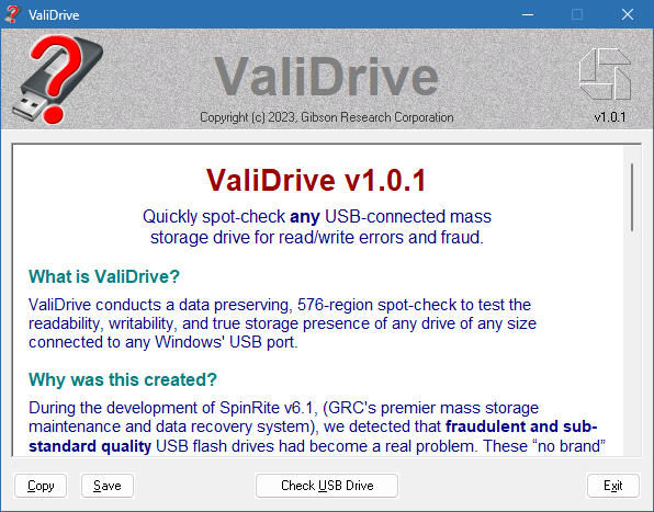 ValiDrive является надежным и безопасным инструментом, который убережет вас от мошенничества и потери данных. Программа разработана известным экспертом по безопасности Стивом Гибсоном, автором таких программ, как SpinRite, ShieldsUP и SecurAble. Вы можете быть уверены в качестве и эффективности ValiDrive.