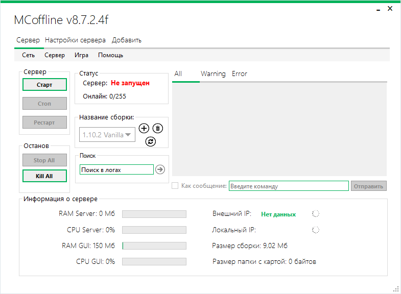 MCoffline делает управление сервером Minecraft более удобным. Вы можете запустить, остановить или перезагрузить сервер с помощью одного клика, а также воспользоваться консолью для ввода команд и просмотра логов. Также имеется возможность удалённого подключения к серверу через RCON или VPN.